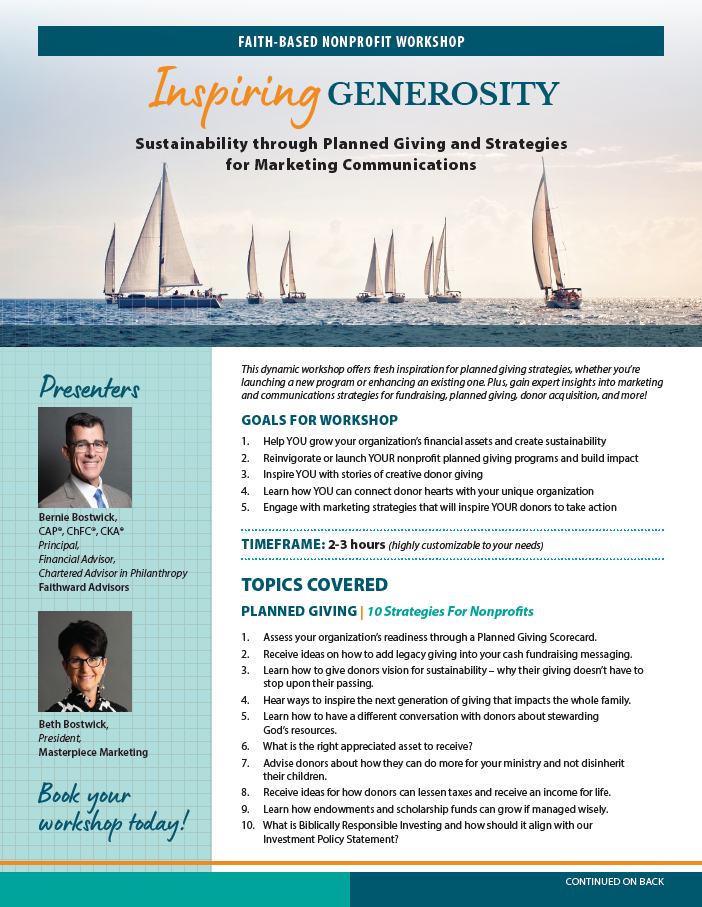 This dynamic workshop offers fresh inspiration for planned giving strategies, whether you’re launching a new program or enhancing an existing one. Plus, gain expert insights into marketing and communications strategies for fundraising, planned giving, donor acquisition, and more!